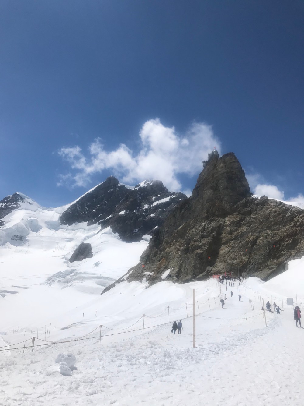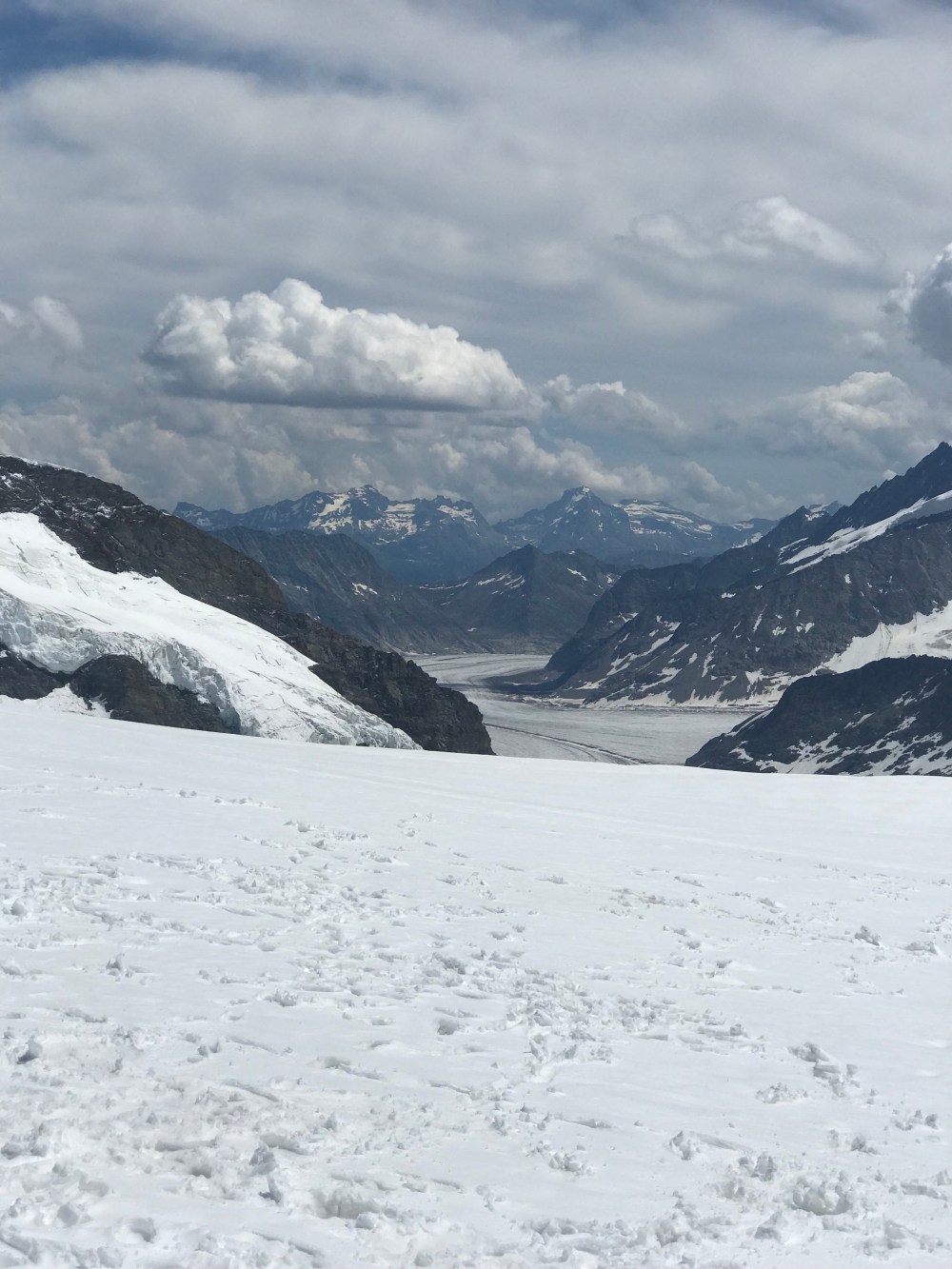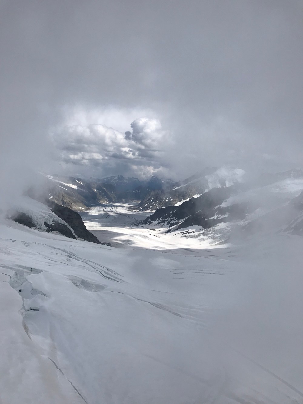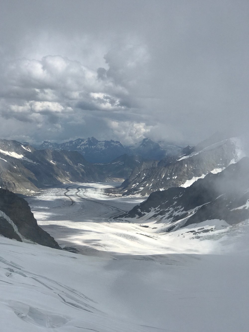 Als wir auf der kleinen Scheidegg ankamen war der Tag noch jung und das Wetter hielt sich. Wir sahen all die Menschen die auf diesem wunderbaren Bahnhof ( Es sieht alles aus wie eine Eisenbahn Landschaft ) in die Züge stiegen oder gerade von Top of Europe runter kamen. Ich erzählte vom größten Gletscher der Alpen, dem „Aletschgletscher“ der aus drei gewaltigem Eisströmen zusammenfließt und 22 km lang ist und zu früheren Zeiten eine dicke von 900 Metern hatte. Erzählte vom Ewigen Eis dort oben von einer Forschungsstation, dem Meteorologischen Observatorium und dass man mit kurzer Hose und T-Shirt bei heutigen 0.9 Grad dort sein kann.