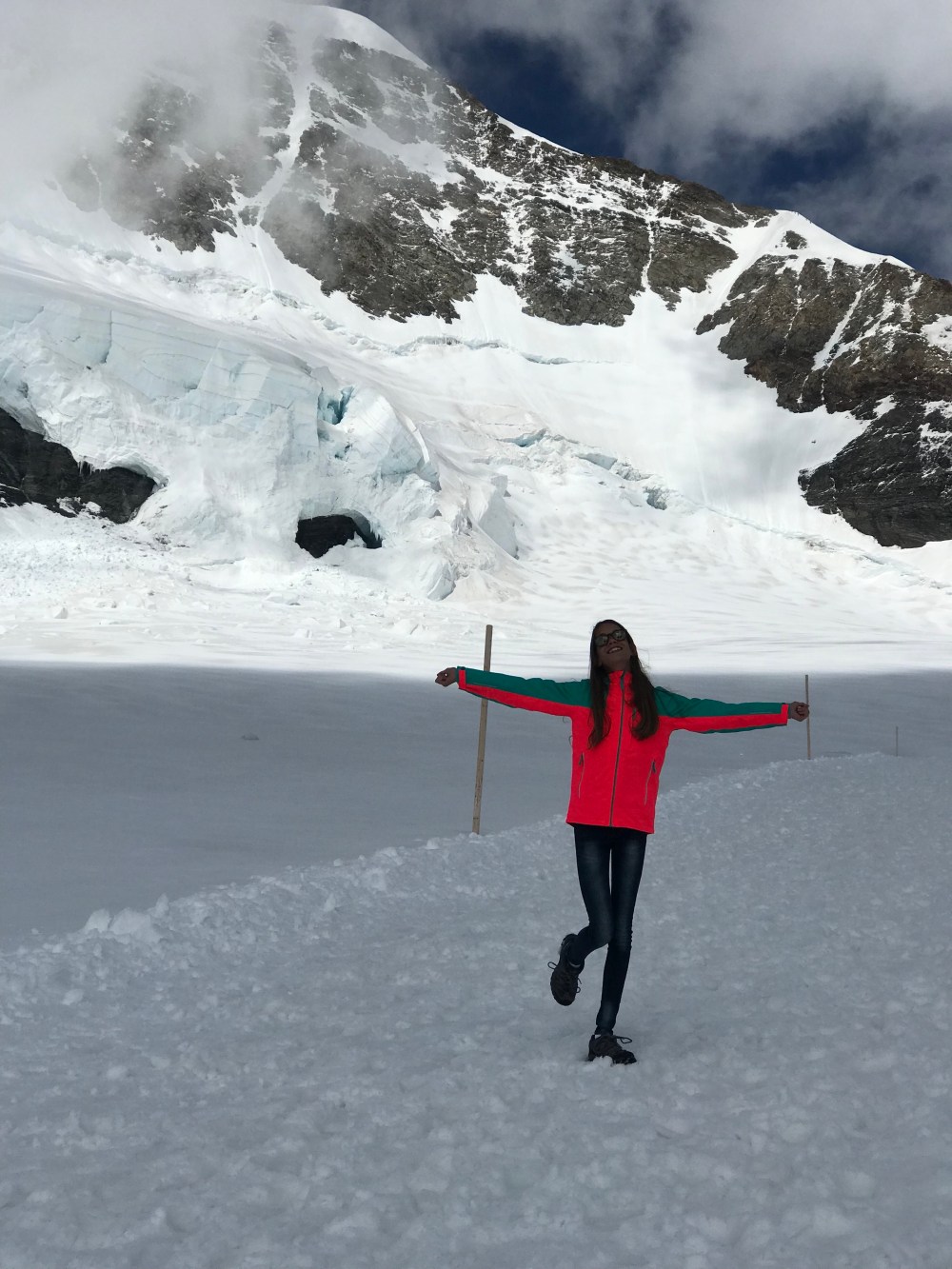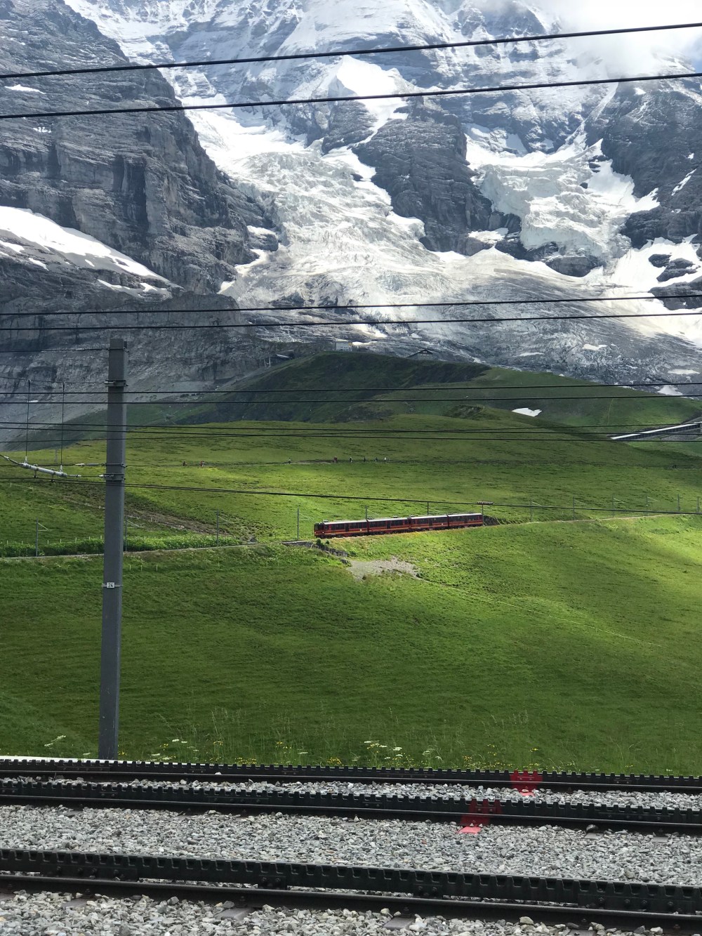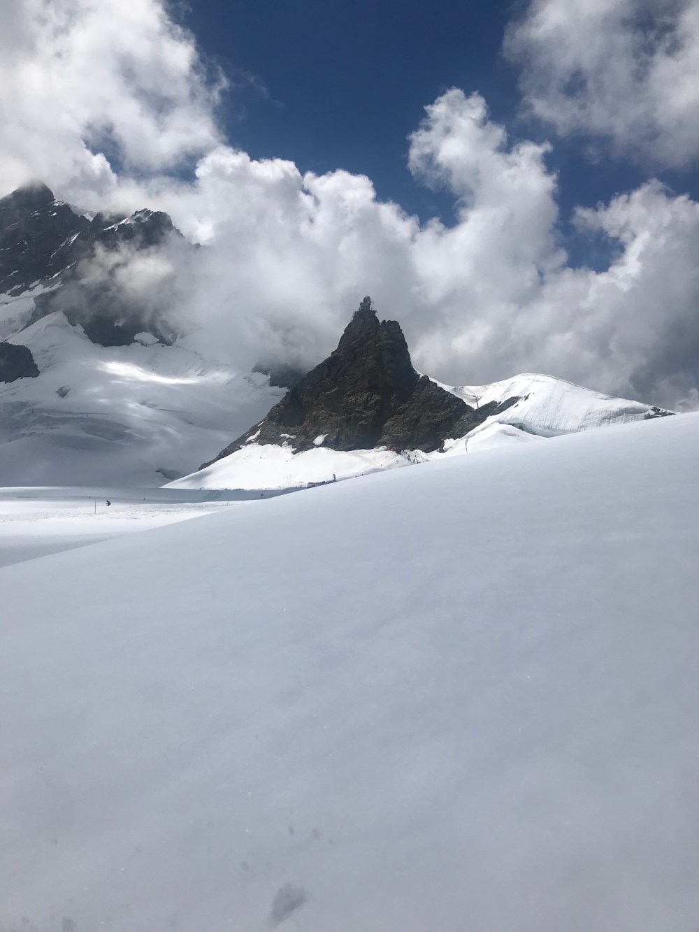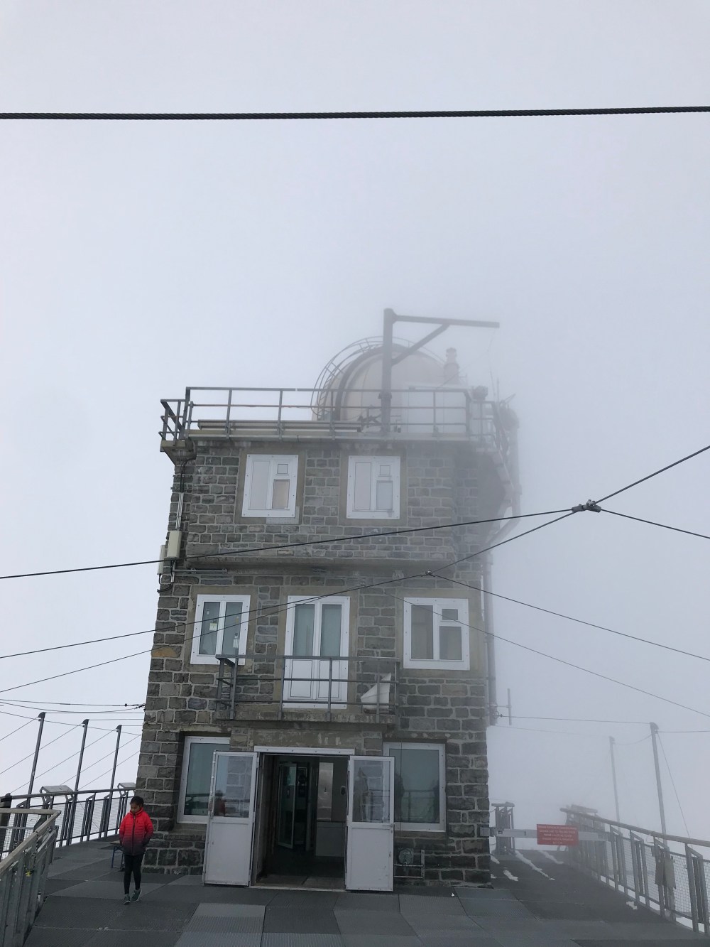 Als wir auf der kleinen Scheidegg ankamen war der Tag noch jung und das Wetter hielt sich. Wir sahen all die Menschen die auf diesem wunderbaren Bahnhof ( Es sieht alles aus wie eine Eisenbahn Landschaft ) in die Züge stiegen oder gerade von Top of Europe runter kamen. Ich erzählte vom größten Gletscher der Alpen, dem „Aletschgletscher“ der aus drei gewaltigem Eisströmen zusammenfließt und 22 km lang ist und zu früheren Zeiten eine dicke von 900 Metern hatte. Erzählte vom Ewigen Eis dort oben von einer Forschungsstation, dem Meteorologischen Observatorium und dass man mit kurzer Hose und T-Shirt bei heutigen 0.9 Grad dort sein kann.
