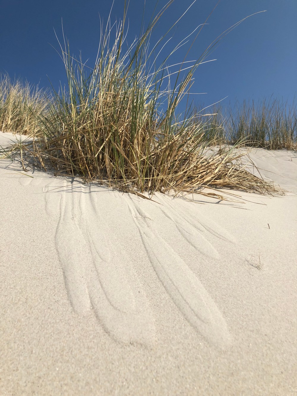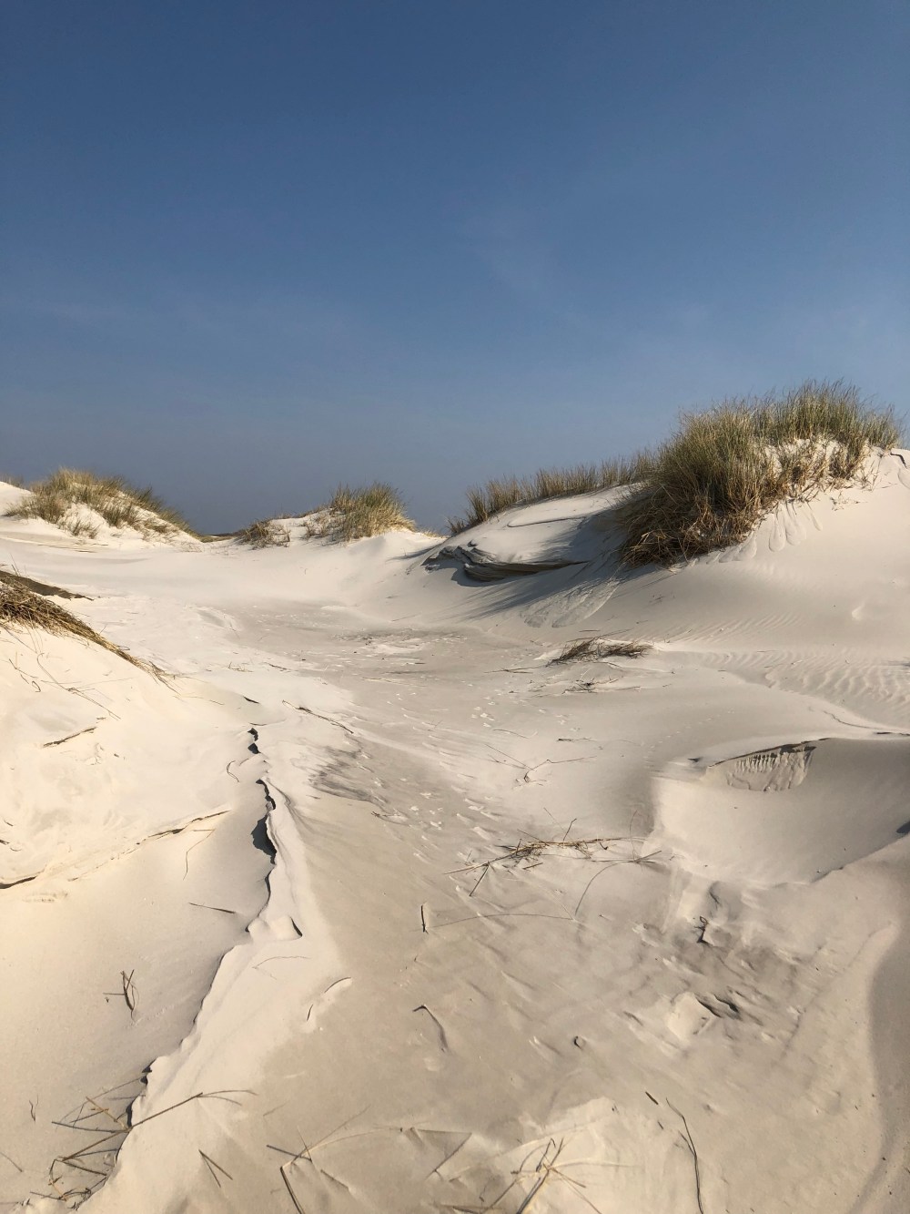 Nach vier Kilometern Strand aufwärts Richtung Norden haben wir uns an einer Düne häuslich eingerichtet. T-Shirt Wetter Anfang April.