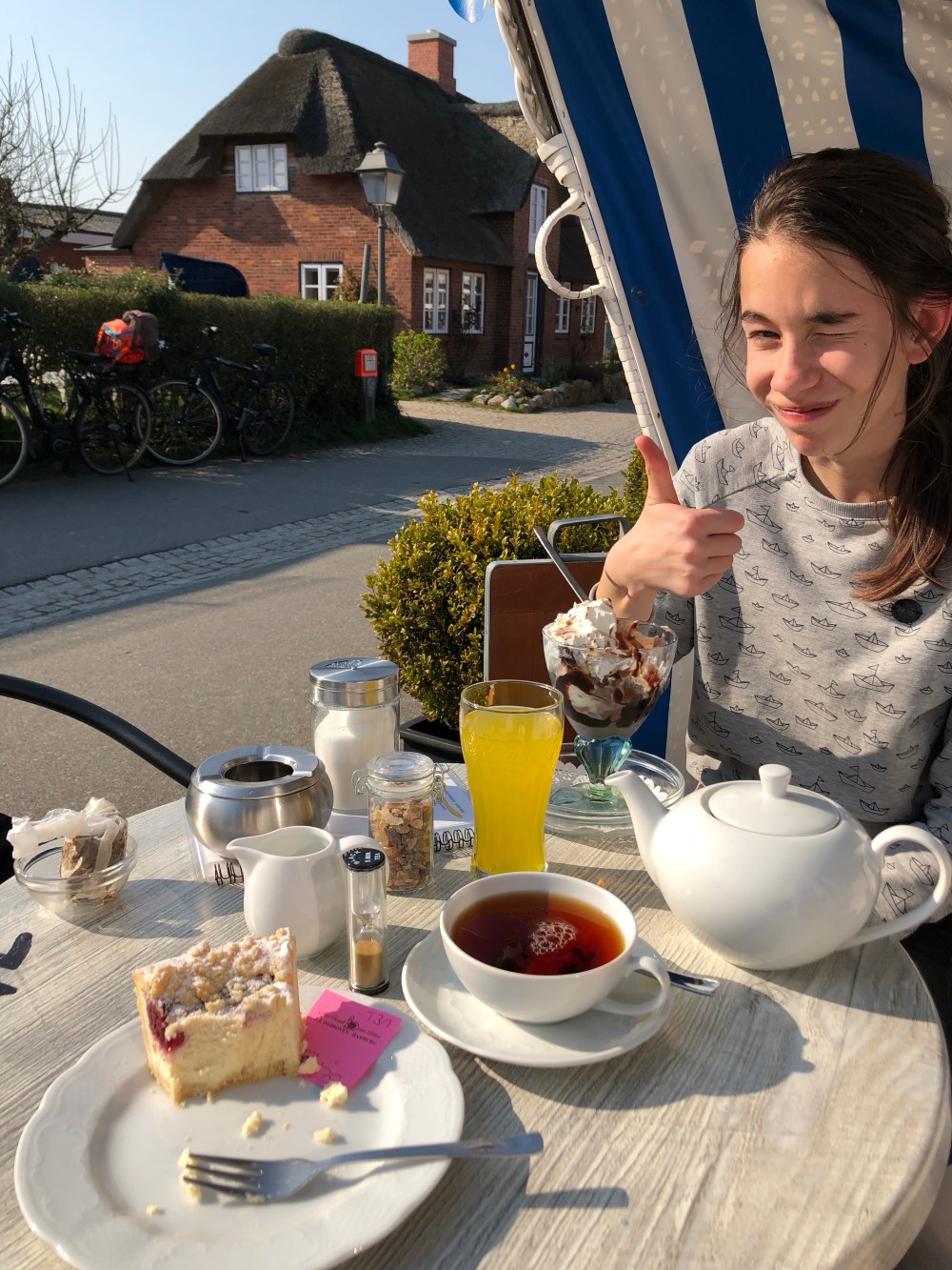 Nach unzähligen Gräben und Burgen bauen machten wir uns nach fünf Stunden auf in Richtung Schlemmer Paradies „Friesencafe Nebel “