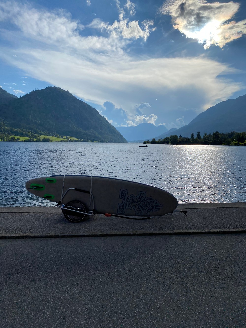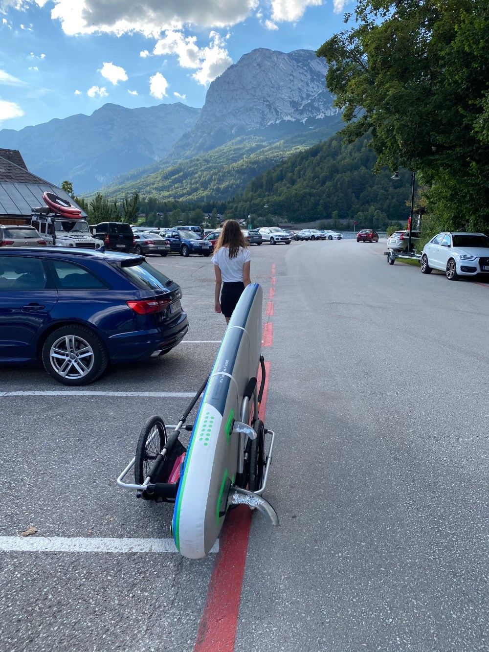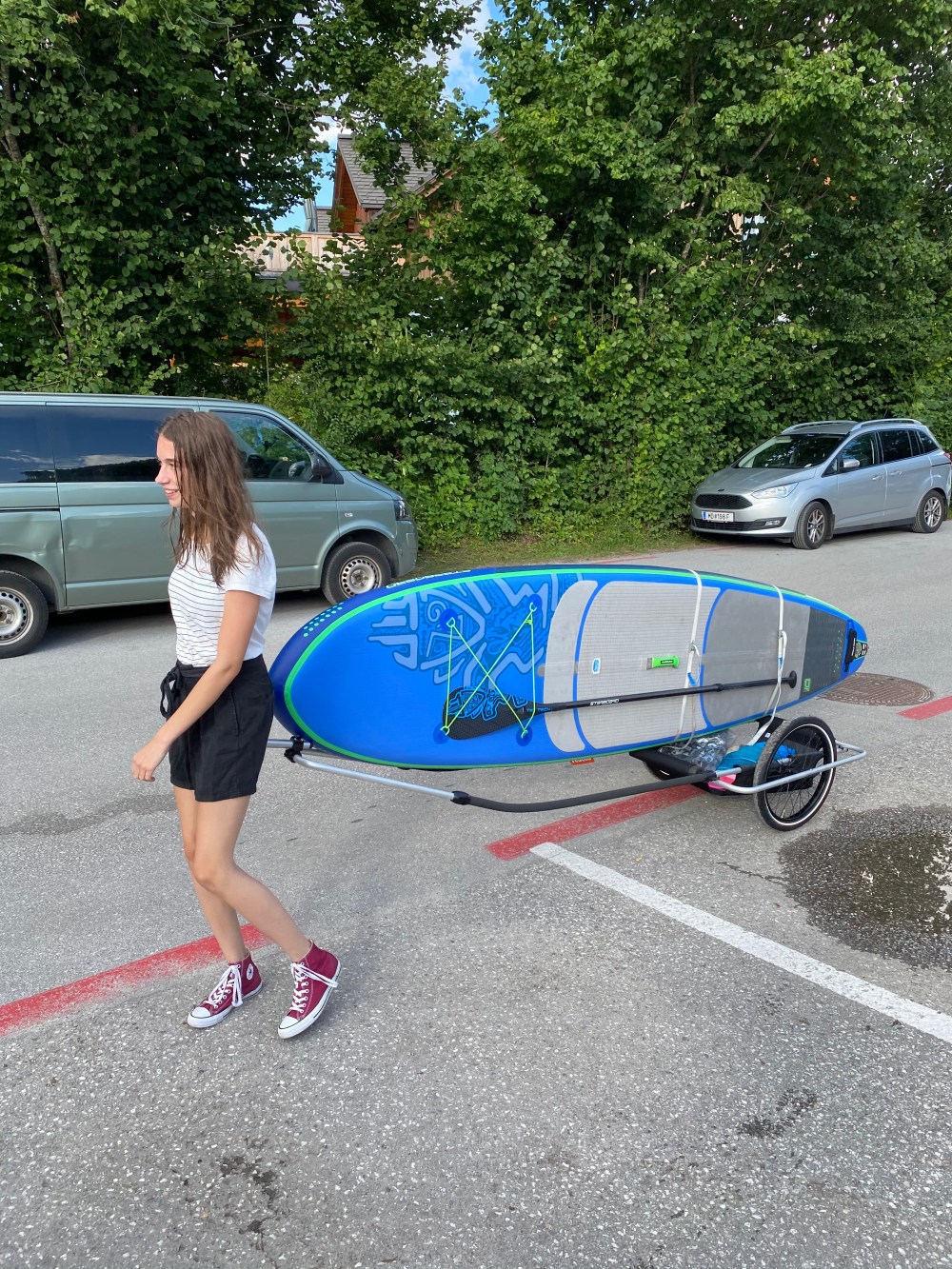 Der Trailer mit dem das SUP transportiert werden soll kann auch ganz genial an das Fahrrad angebaut werden, okay man hat dann schon fast Überlänge.