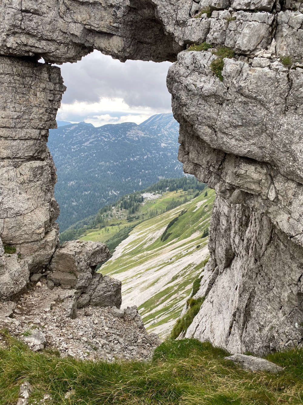 Spontan entschließen wir uns zum Loser Fenster zu laufen. Ein mehrere Meter Hohes Felstor mit atemberaubenden Blick auf einen gewaltigen Felssturz in ein Almgebiet.
