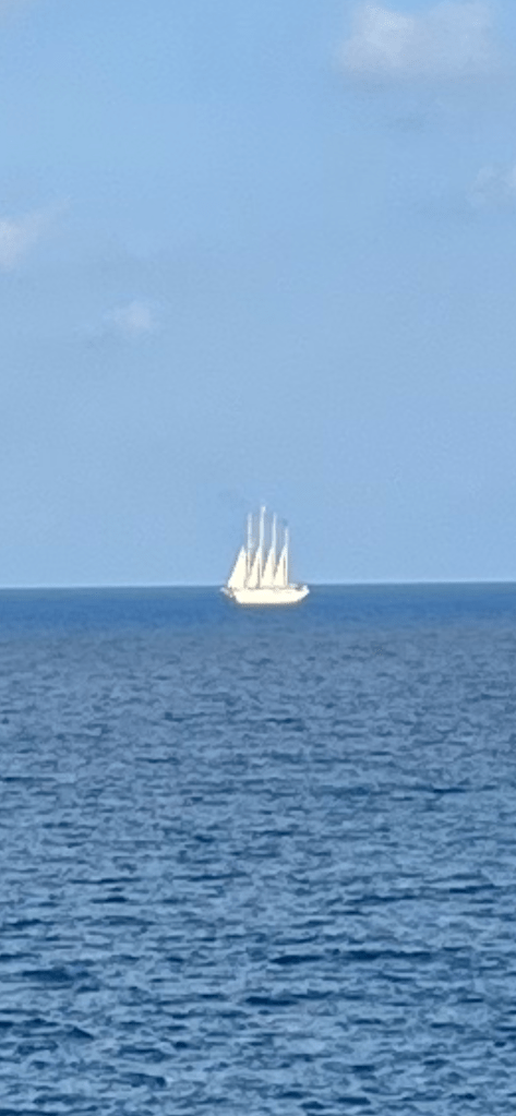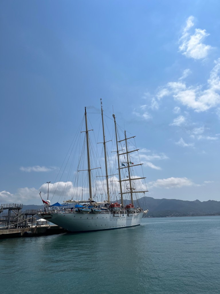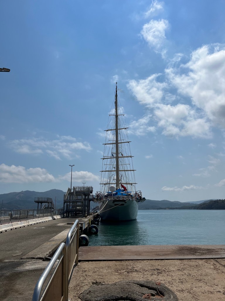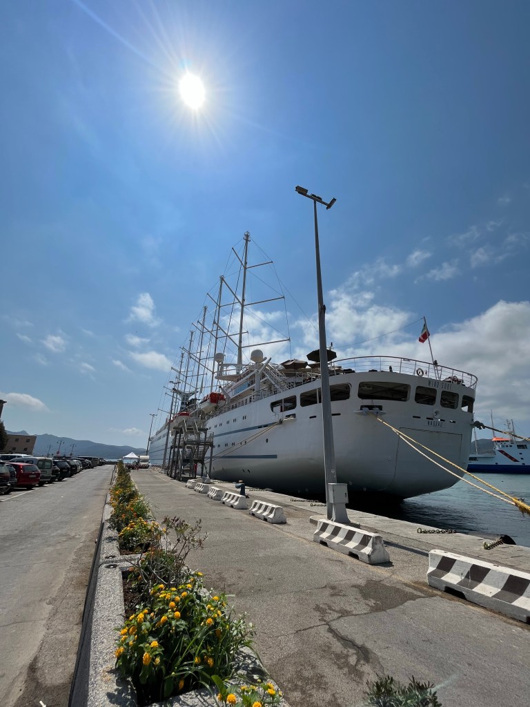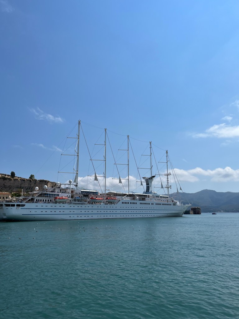 Eine schöne Überraschung am Morgen, ein Viermaster segelt unter halber Takelage in den Hafen von Portoferraio. Dort hat schon in der Nacht der zweitgrößte Motorsegler der Welt angelegt, ein Fünfmaster.