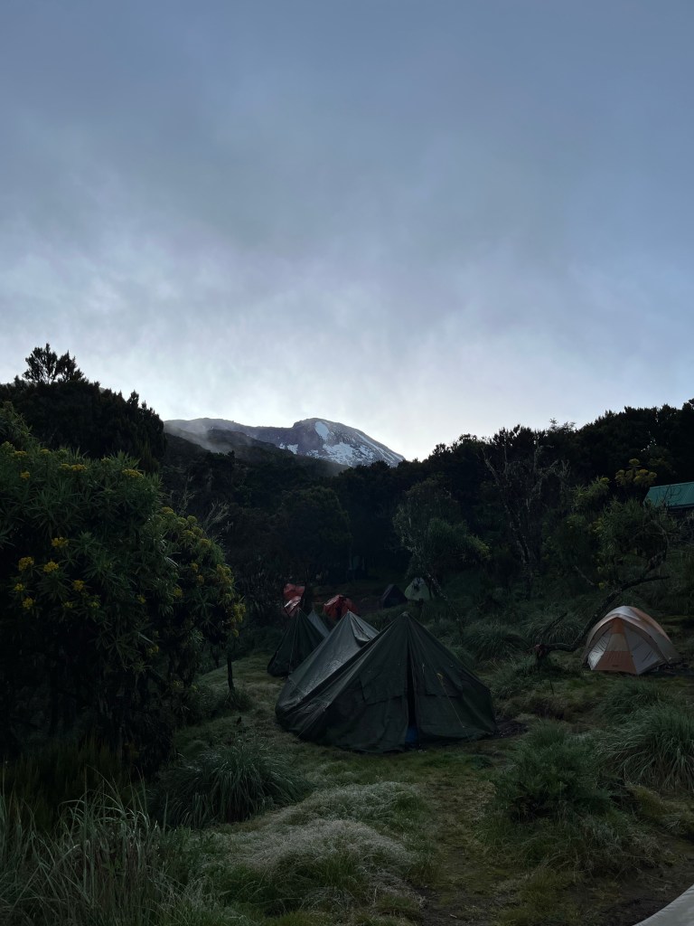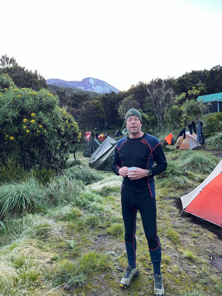 Mit einmal Lichtet sich der Dunst und die Sonne kommt raus, die Porter machen aus unserem Frühstücks Tisch ein Cabrio in dem sie kurzer Hand das Zelt gänzlich abbauen. Uns allen ish anzumerken wie gut die Sonne tut, ihre warmen Strahlen und zum ersten Mal haben wir den Blick auf den Gipfel, Motivation pur…