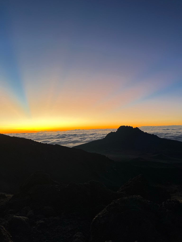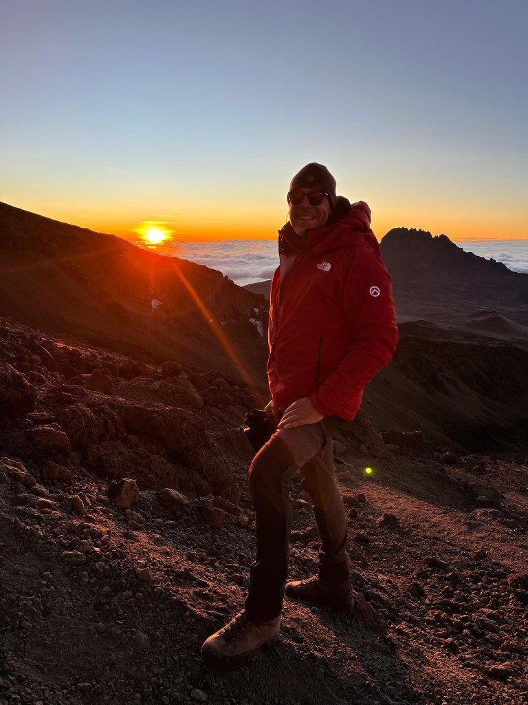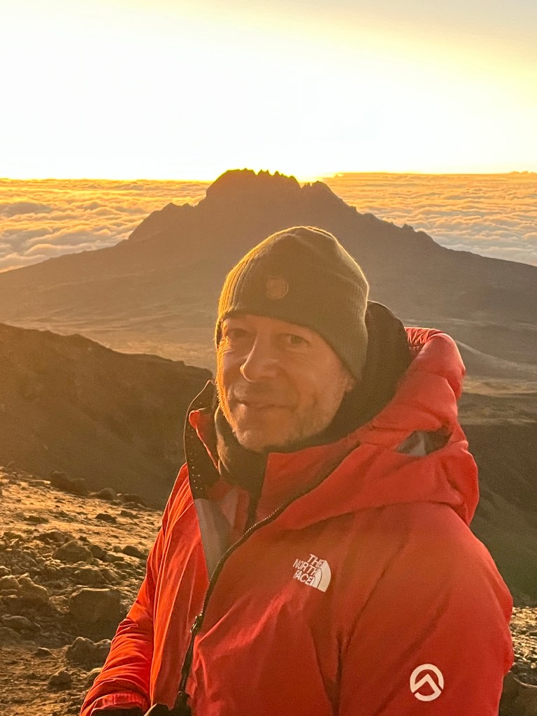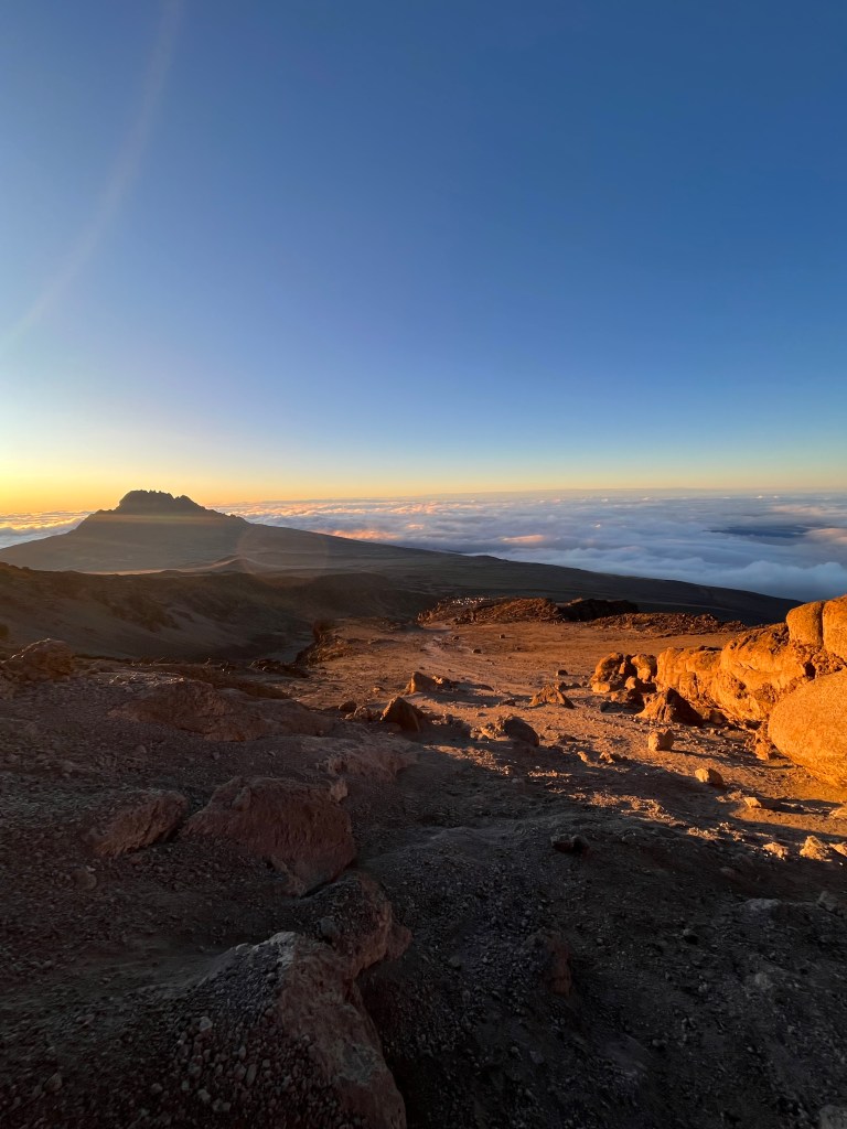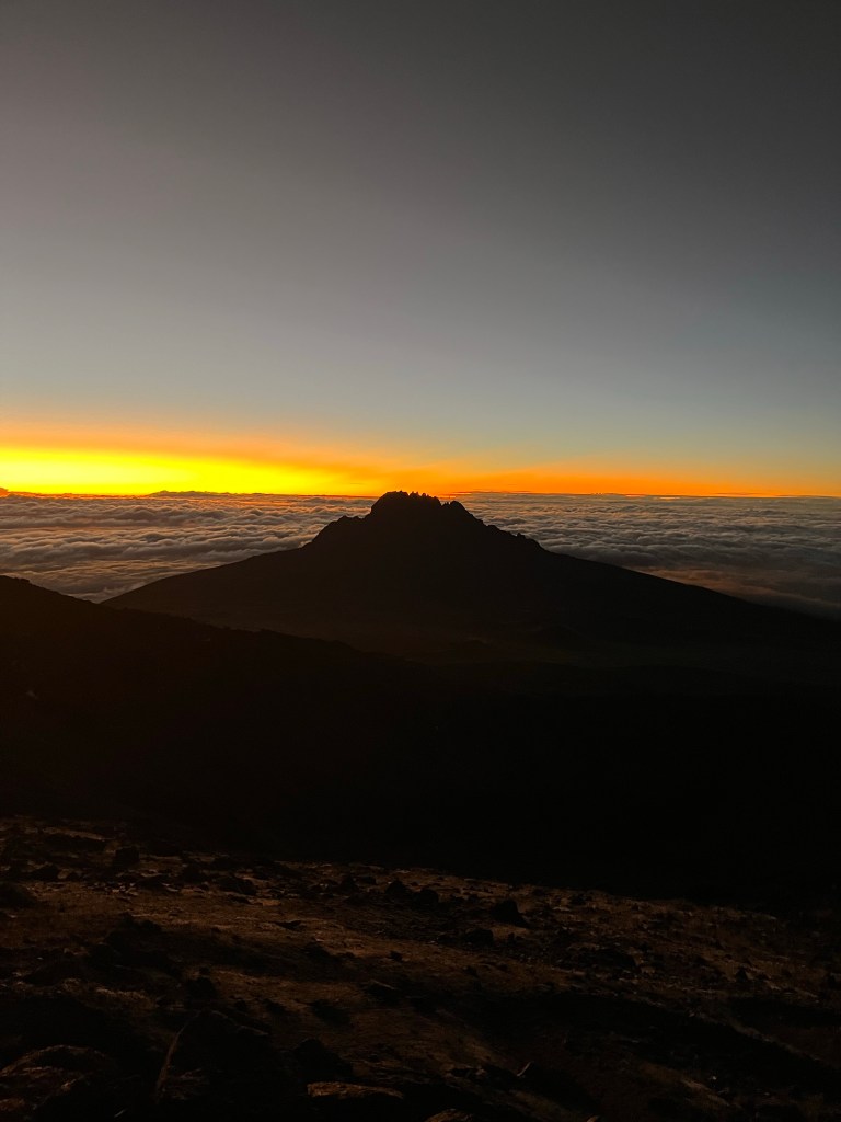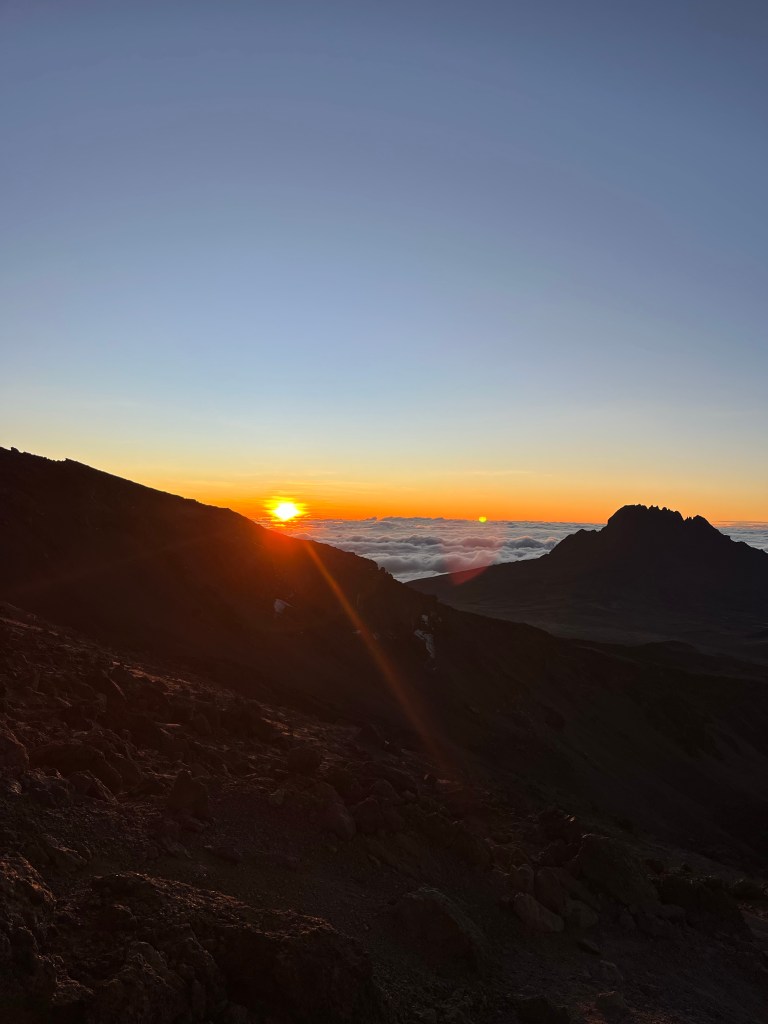 Es ist unglaublich kalt, mein Blick ist nun bergab gewandt in die Ebene, am Horizont kommt der erste Lichtschimmer der aufgehende Sonne, habe das Gefühl für Zeit und Raum verloren und folge nur fast laufend meinen Guide, wir sind nun völlig alleine in dieser Mondlandschaft, kein Geräusch was wir nicht selber erzeugen und vor uns der aufgehende Tag. Wir stoppen und die Seele von Mensch holt zwei „Caprisonne“ aus seinem Rucksack, wir setzen uns hin, still, keiner sagt was und schauen dem Schauspiel des Natur zu . Es ist mein magic Moment auf dieser Tour, ich durfte leider nicht den Gipfel erklimmen, aber habe dafür ein Geschenk bekommen was dann keiner hatte. Diese Magie des Berges, die Stille weit über 5500 Meter und der Blick auf den unter uns liegenden Mount Mavenci mit seinen fast 5200 Metern , dabei ein Caprisonne trinken. Ich bin glücklich und es ist wohl der schönste Ort in meinem Leben wo ich je ein Getränk genießen durfte.