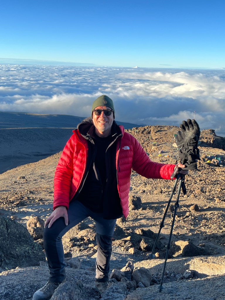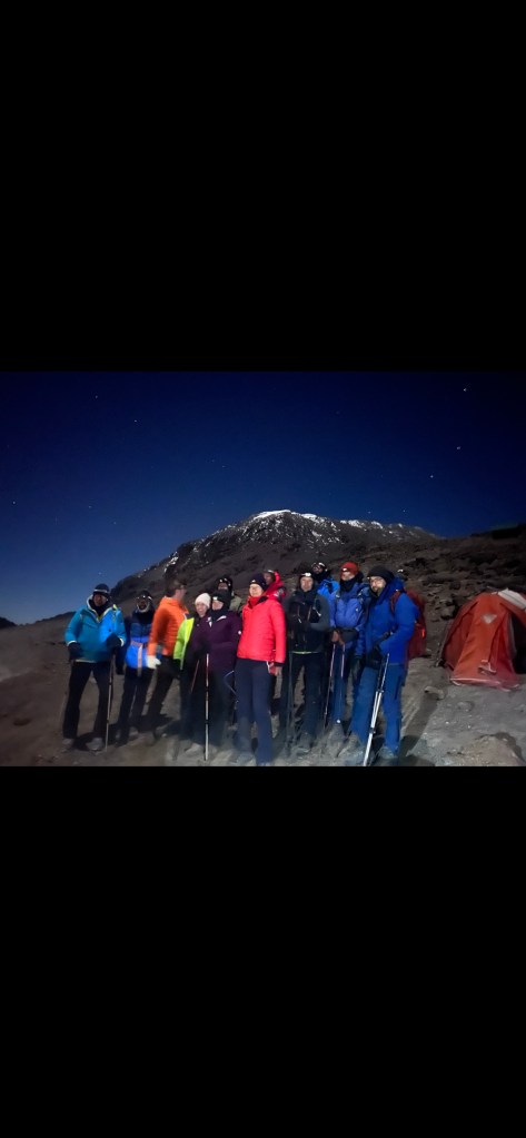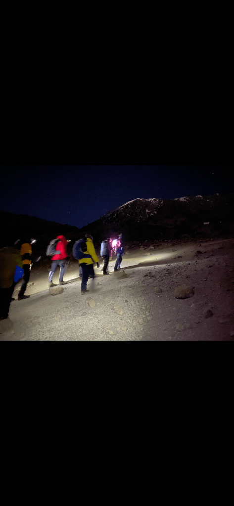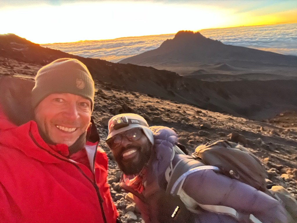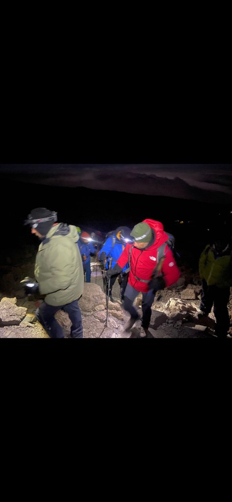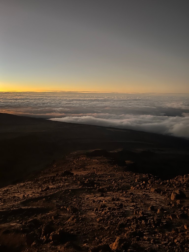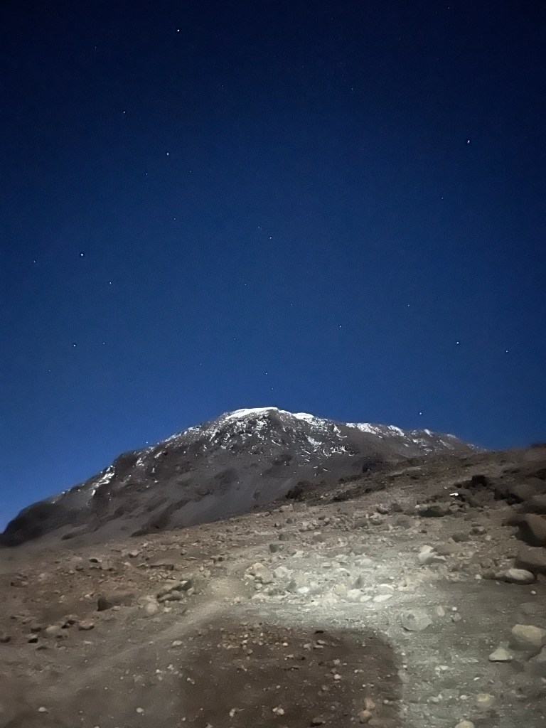 Es ist unglaublich kalt, mein Blick ist nun bergab gewandt in die Ebene, am Horizont kommt der erste Lichtschimmer der aufgehende Sonne, habe das Gefühl für Zeit und Raum verloren und folge nur fast laufend meinen Guide, wir sind nun völlig alleine in dieser Mondlandschaft, kein Geräusch was wir nicht selber erzeugen und vor uns der aufgehende Tag. Wir stoppen und die Seele von Mensch holt zwei „Caprisonne“ aus seinem Rucksack, wir setzen uns hin, still, keiner sagt was und schauen dem Schauspiel des Natur zu . Es ist mein magic Moment auf dieser Tour, ich durfte leider nicht den Gipfel erklimmen, aber habe dafür ein Geschenk bekommen was dann keiner hatte. Diese Magie des Berges, die Stille weit über 5500 Meter und der Blick auf den unter uns liegenden Mount Mavenci mit seinen fast 5200 Metern , dabei ein Caprisonne trinken. Ich bin glücklich und es ist wohl der schönste Ort in meinem Leben wo ich je ein Getränk genießen durfte.