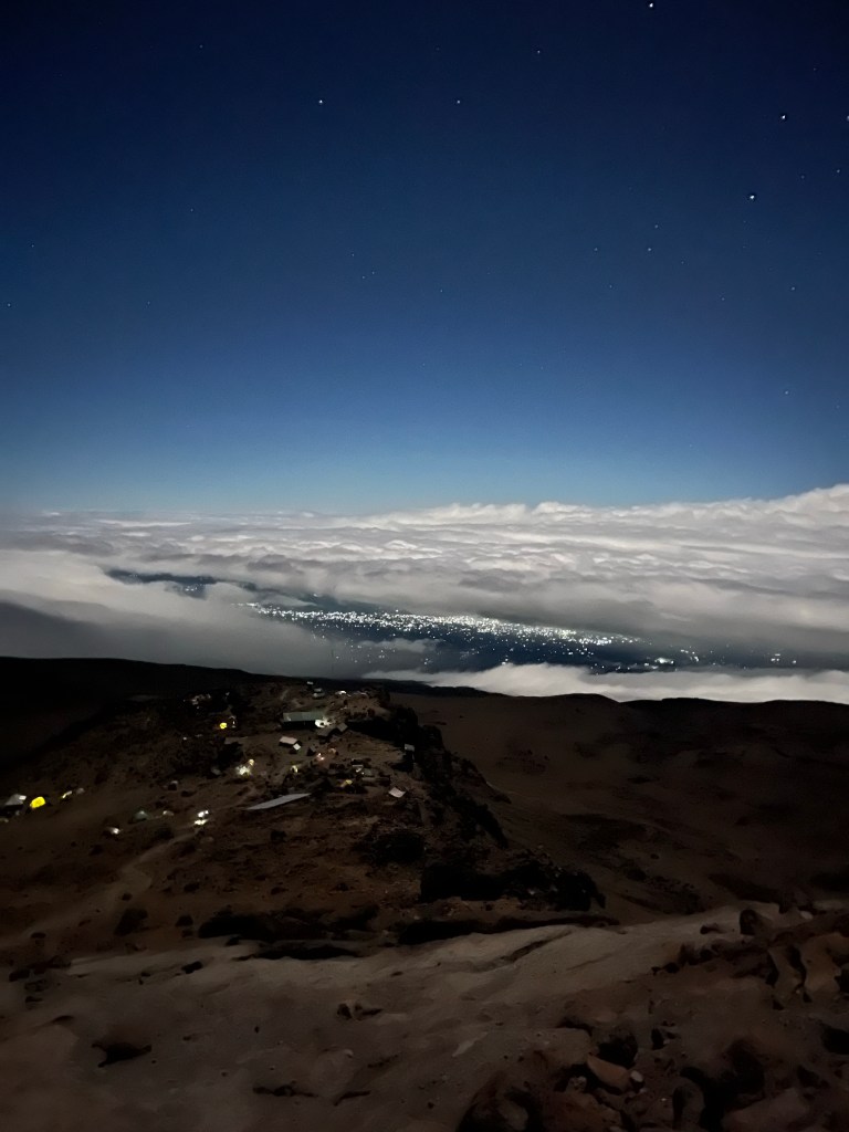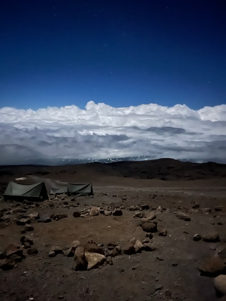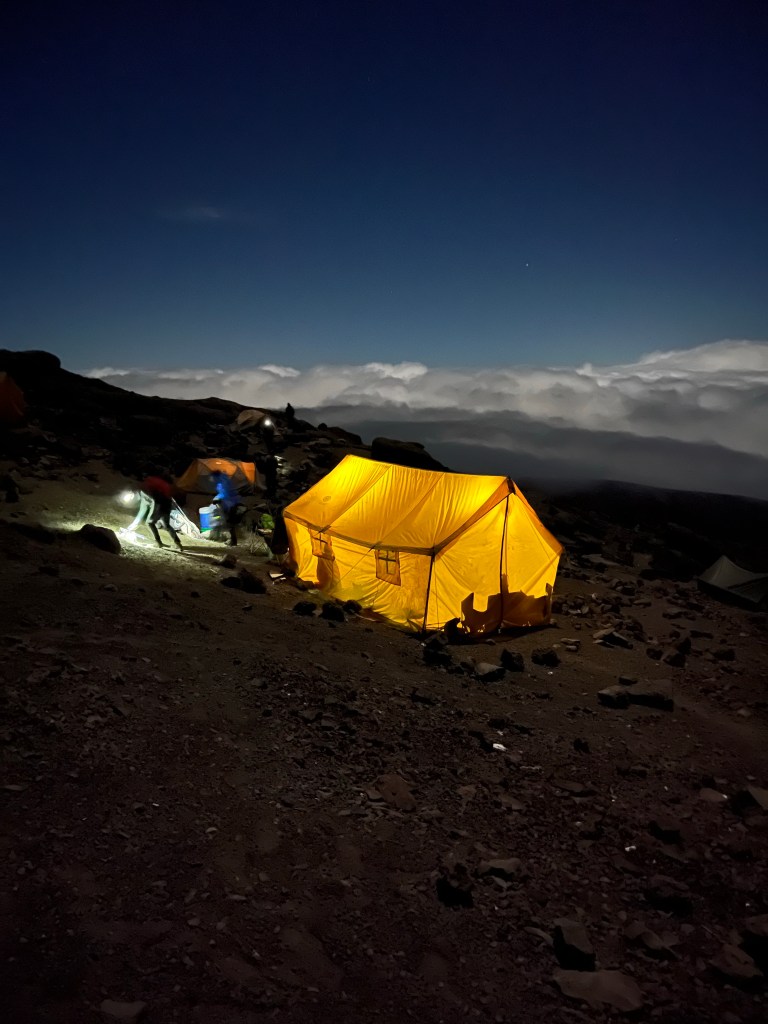Draußen eine klare Mondnacht, die Landschaft ist unwirklich, die Wolken unter uns werden durch das Licht des Mondes beschienen, Sterne funkeln am tiefblauen Himmel, alles ist klar zu erkennen. Unten in der Ebene können wir Lichter sehen, 60-70 km entfernt. Das gelbe Verpflegungs- und Gruppenzelt leuchten von innen und bildet einen farblichen Kontrast zum Rest.