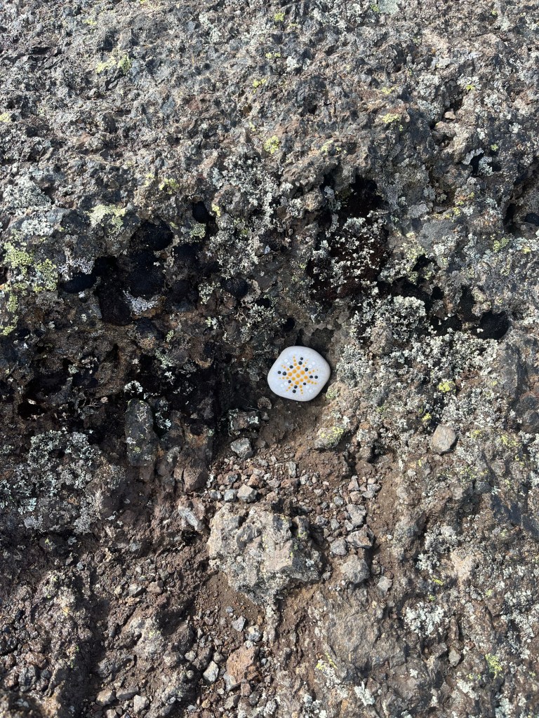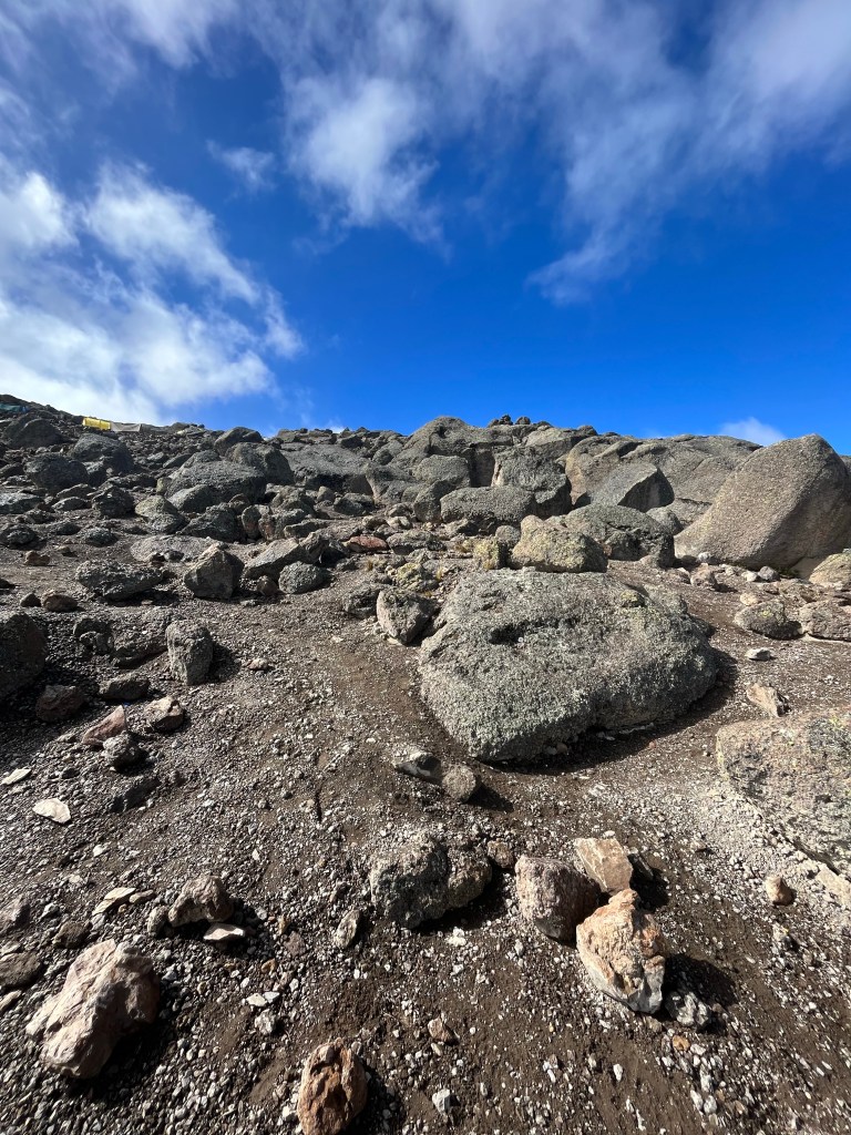 Ich hatte noch eine Aufgabe. Stine hatte mir einen bemalten Stein vor der Reise mitgegeben den ich am Gipfel ablegen sollte. Die Höhenkrankheit hatte dies nun verhindert und vor dem Aufbruch zum Abstieg schaute ich mit im Barafu Camp um , um einen geeigneten Platz für mein Mitbringsel zu suchen. In einem großen Felsblock entdeckte ich eine Mulde, küsste den Stein und legte ihn ab.
