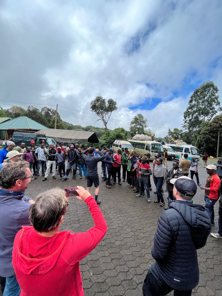 Wir erreichen das Mweka Gate, der Ausritt aus dem Nationalpark. Ein ungewohntes geschäftiges Treiben empfing uns, und Einheimische die Geld damit verdienten uns die matschigen Bergstiefel zu putzen. Ein Eimer Wasser eine Bürste und flinke Hände hatten die Schuhe im nu sauber. Für mich eine komplette Irritation mit meinen Werten. Menschen die vor einem knien und die Stiefel putzen obwohl man sie noch anhat für 5 Dollar , habe mich selten in einem Moment so unwohl gefühlt aber ich weiß auch wie wichtig diese 5 Dollar für die Menschen sind.
